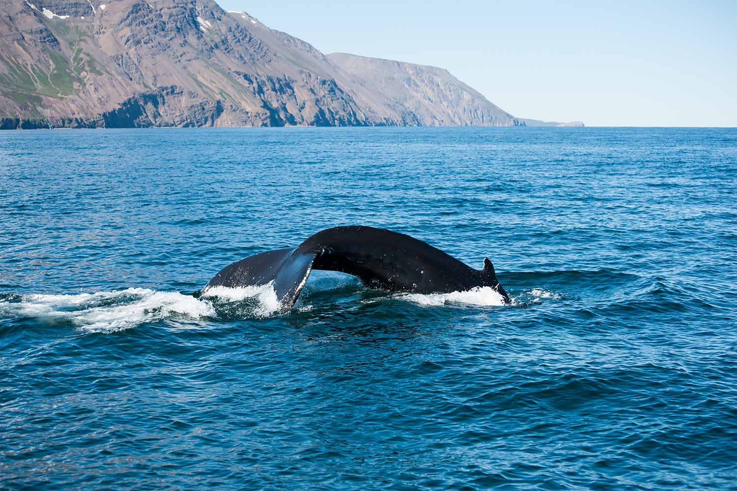 Another popular place to go whale watching in Iceland is Dalvík. This fishing town is situated on the Tröllaskagi Peninsula, in the Eyjafjörður fjord. Despite its population being only around 1,500 citizens, the town attracts many tourists with its beautiful scenery, hiking trails, ski slopes, and of course, whale-watching tours.