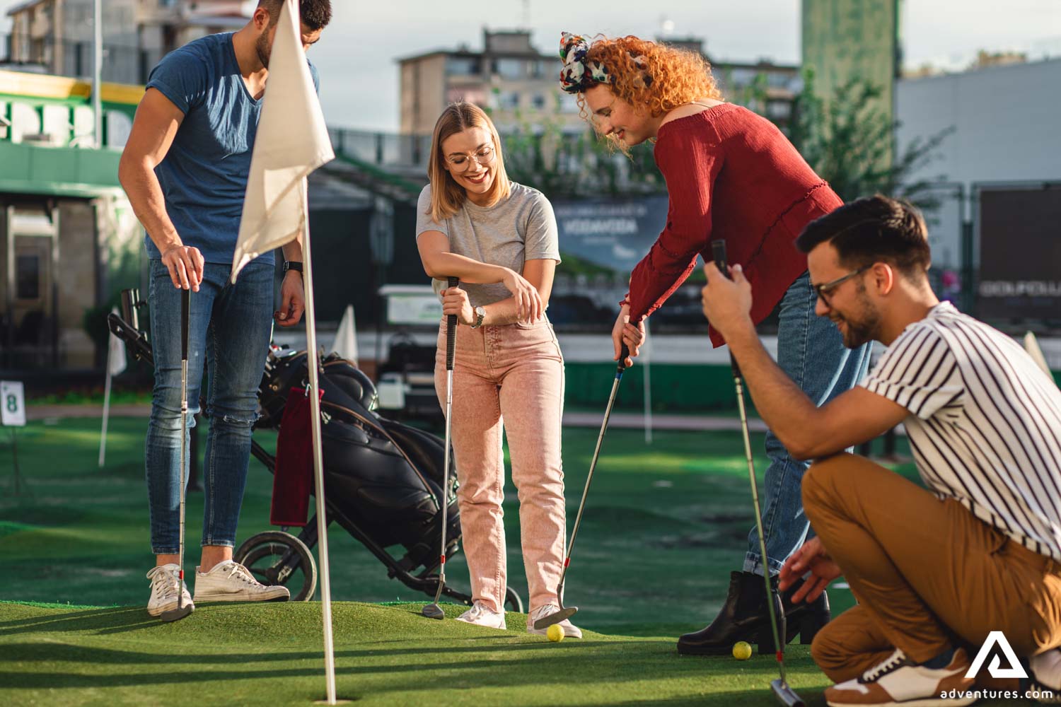 Group of friends enjoy playing a mini golf