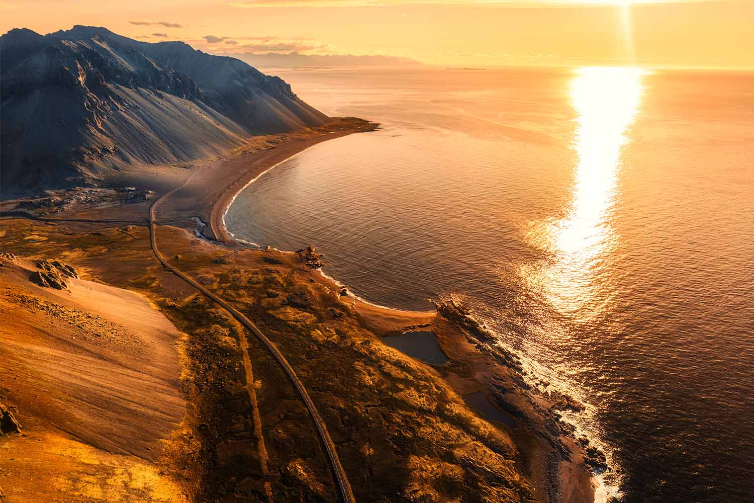 Road in Iceland by the mountains and seashore at sunset