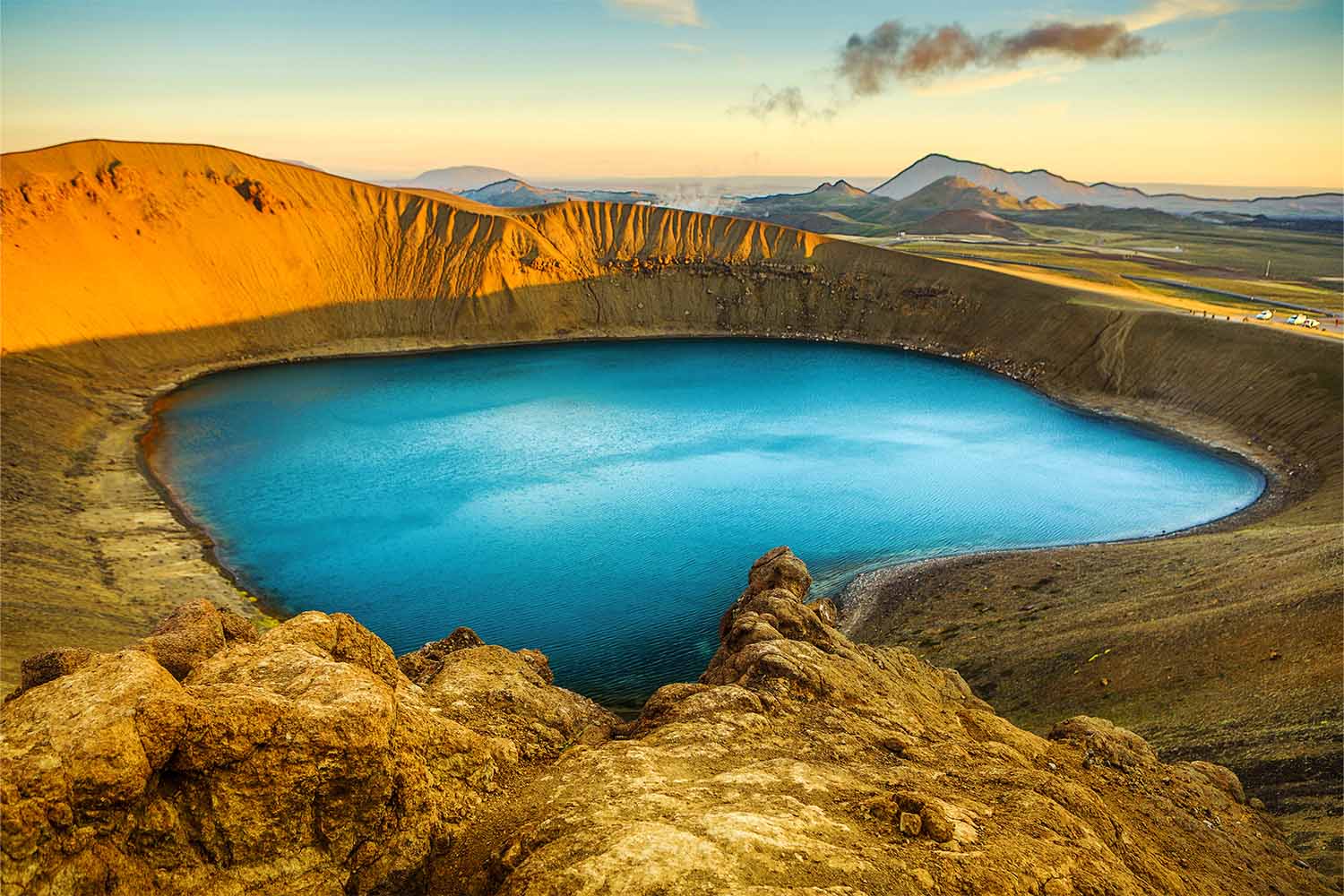 Admire the turquoise-blue geothermal water of Víti, a volcanic crater. The water here never freezes and ranges from boiling to hot, making it a must-see destination in the Iceland highlands. Imagine standing on top of a volcanic crater1100 meters above sea level while soaking up the stunning view of the Icelandic highlands. It used to be possible to swim in the crater’s lake, however, with the recent geothermal activity, it is not safe anymore to do so.