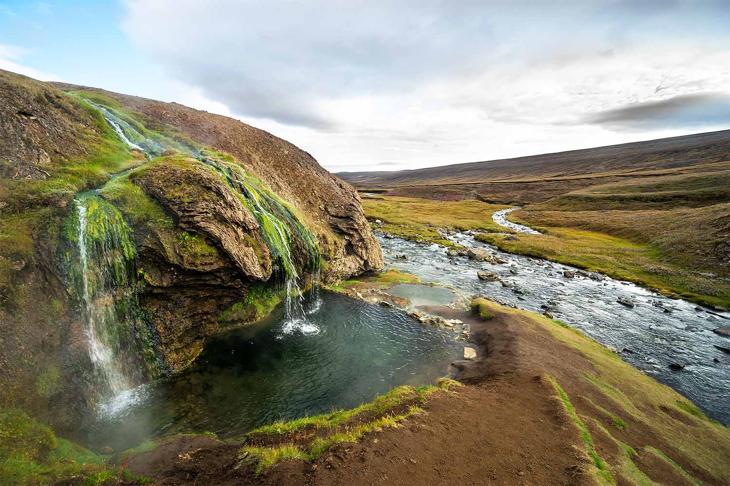 Take advantage of a relaxing escapein the heart of Iceland's majestic mountains. A smallthermal poolis within walking distance of the Kerlingarfjöll Mountain Resort. It will only take about 20 minutes to complete the 1.3-kilometer walk along the river and reach this hidden gem. Follow the well-marked trail on the right side of the small river as you walk upstream until you get to the natural hot spring. It is important to note that no changing facilities are available, so bringing a bag to keep your clothes dry is recommended.