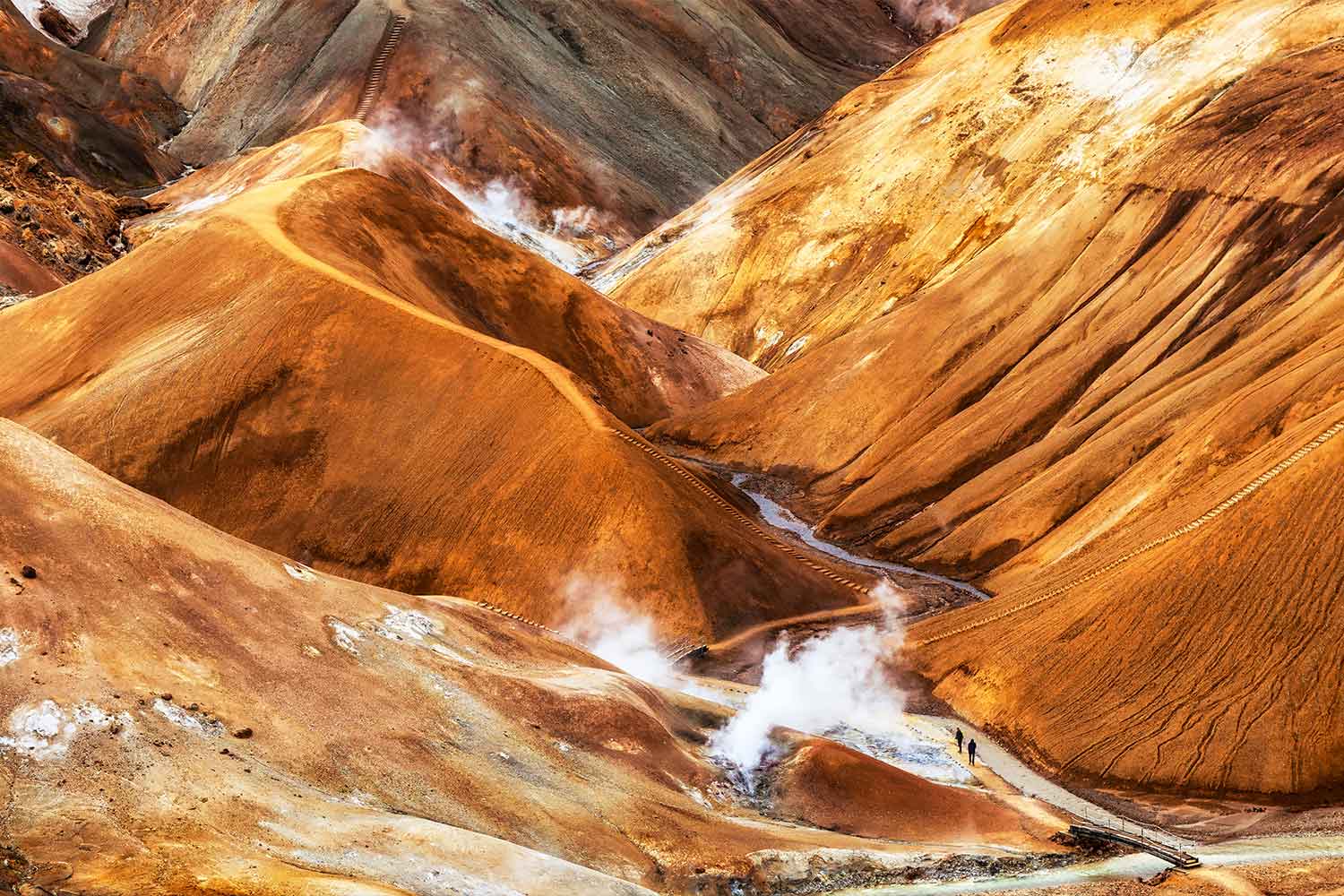 Next on the itinerary is Kerlingarfjöll, the multicolored mountain range, often called “the hiker’s paradise.” Kerlingarfjöll was a renowned summer skiing hub, but the region was forced to close down due to the effects of global warming. Today, the area is a favorite destination for hikers seeking to explore its raw, unspoiled wilderness. The majestic Kerlingarfjöllis also a part of the vast volcanic system, home to one of Iceland's most active geothermal areas. The mountains seem to merge with an ethereal sea of steam, creating a surreal environment that overwhelms the senses. Here you can explore numerous marked and unmarkedhiking trails, each leading to an immersive experience in this dreamy world.