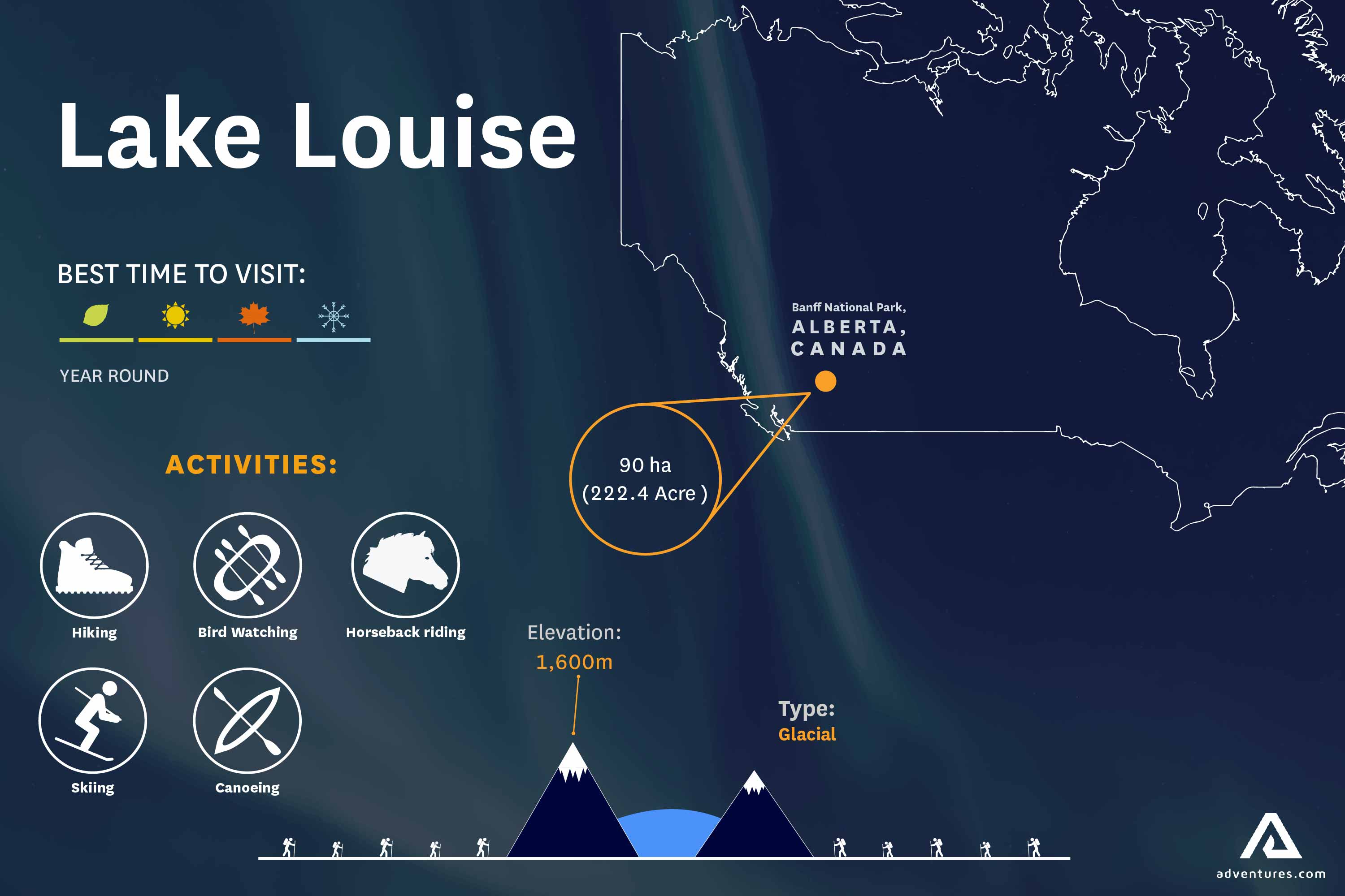 Lake Louise is located in Banff National Park, Canada’s oldest national park, in the Canadian province of Alberta. It sits at an elevation of 5,679 ft (1,731 m) making it Canada's highest permanent settlement. The lake extends northeast for around 1,5 mi (2.4 km) and is around 0.75 mi (1.2 km) at its widest point. The Lake Louise area is separated in two – the larger community is known as Lake Louise Village and is directly accessible via the Trans-Canada Highway, while Upper Lake Louise is directly next to the lake itself and contains the famous Lake Louise Chateau, along with a host of incredible hiking, biking, and horse-riding trails.