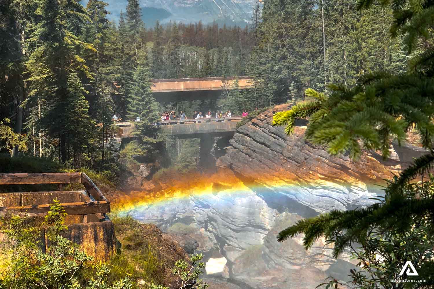 A dramatic waterfall that is located around 17mi (30 km) to the south of Jasper, the Athabasca Falls is an absolute must for anyone visiting Jasper National Park. The waterfall’s cascade isn’t especially tall (standing around 75ft / 23 m), however, it is voluminous – thundering down into the picturesque gorge below. Make sure you bring your camera – because the vivid blue color of the waterfall, set to a backdrop of rolling green fir trees, makes for stunningly beautiful photos.