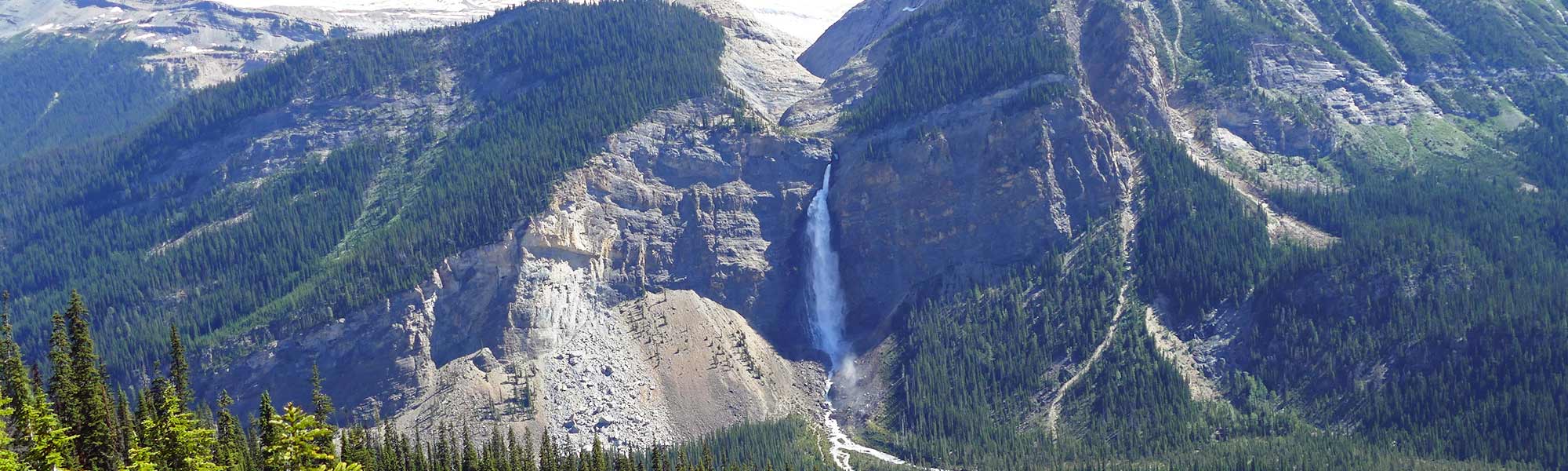 Takakkaw Falls is located within the Rocky Mountains, which formed 80 million to 55 million years ago as plates slid under the North American plate, forming large peaks and valleys. The falls are the result of meltwater from the Daly Glacier, part of the 15-square-mile Waputik Icefield. The area was likely first inhabited at the end of the last ice age, and the Falls were named and used by the First Nations people for thousands of years.