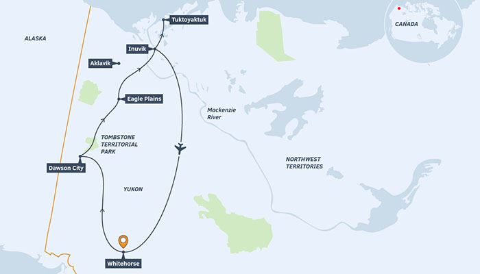This journey is available in two directions. On the northbound tour, you drive from Whitehorse to Tuktoyaktuk and fly back from Inuvik to Whitehorse at the end of the tour. On the southbound tour, you fly from Whitehorse to Inuvik on Day 1 and drive from Tuktoyaktuk to Whitehorse.