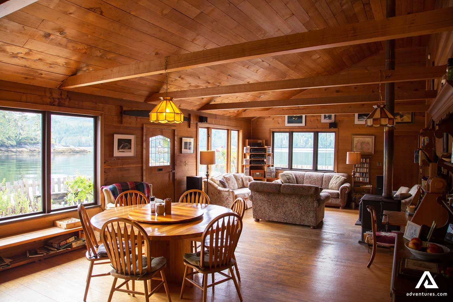 This unique floating lodge was designed and built as a solid floating structure that provides cozy, personal, and comfortable accommodations for small groups or families. Using red and yellow cedar from the nearby forest, the lumber for the lodge was milled on-site. The lodge is heated by a woodstove with solar power and a generator to provide electricity.