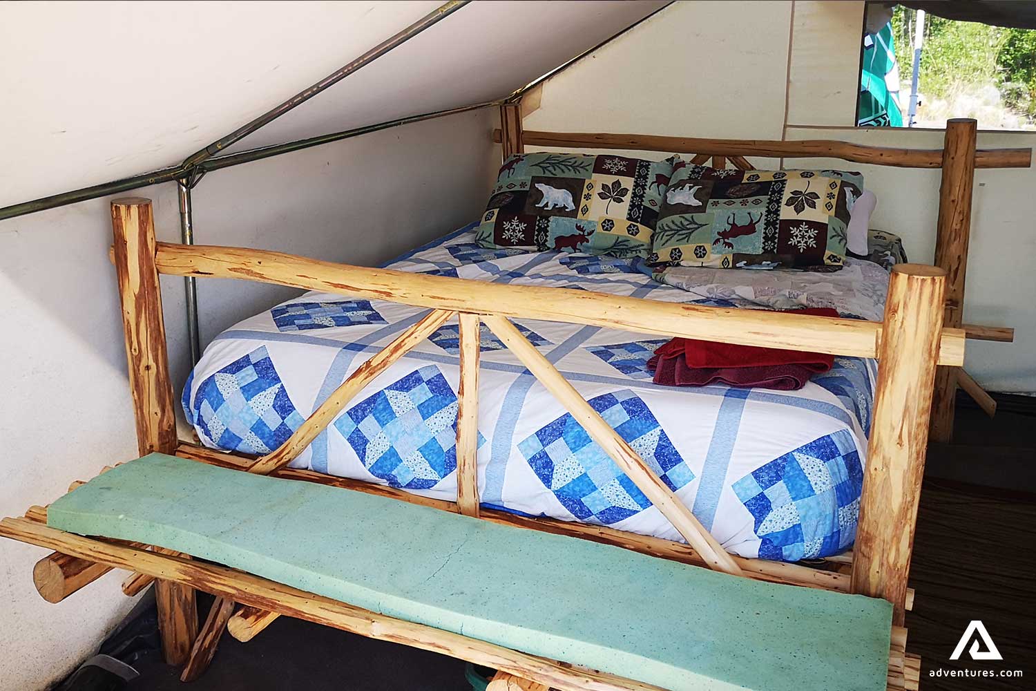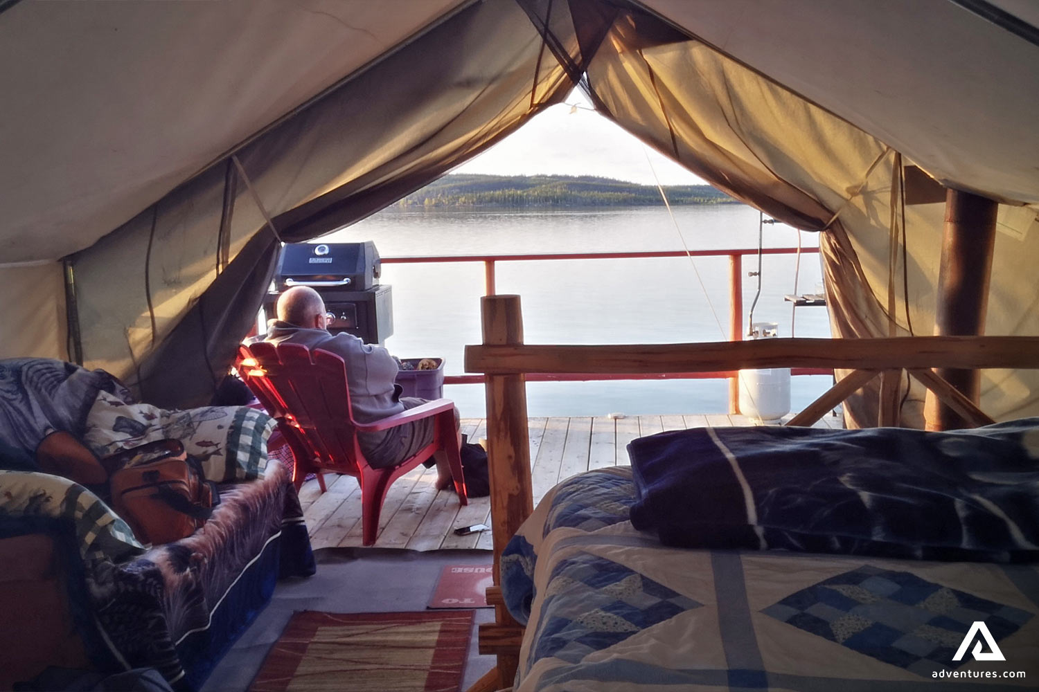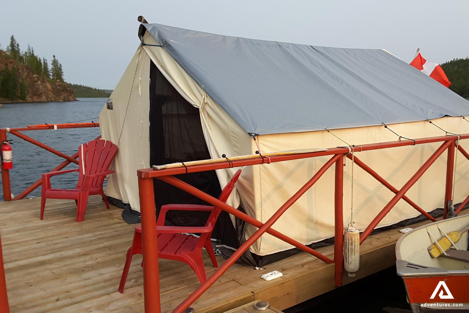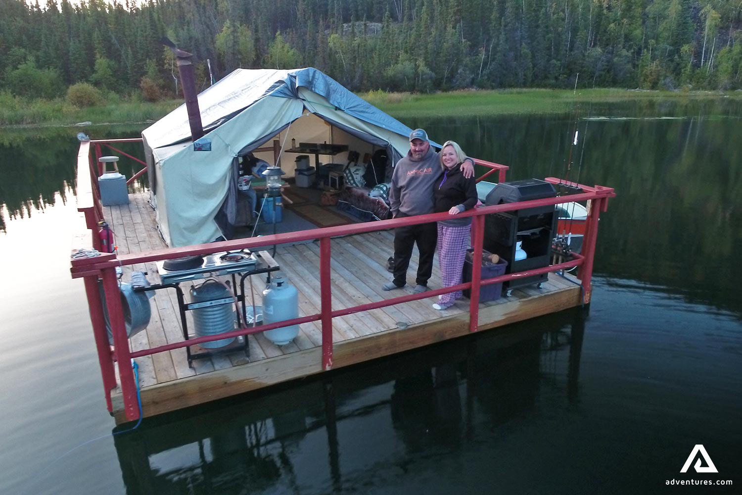Accommodations are in a 12' x 14' wall tent on a 14' x 28' steel pontoon barge. The tent has two bunk beds, one fold out chair and one cot, wood stove and BBQ, sink, refrigerator and 15 hp outboard engine for moving the camp around the lake. Outdoor showers available at the main lodge.