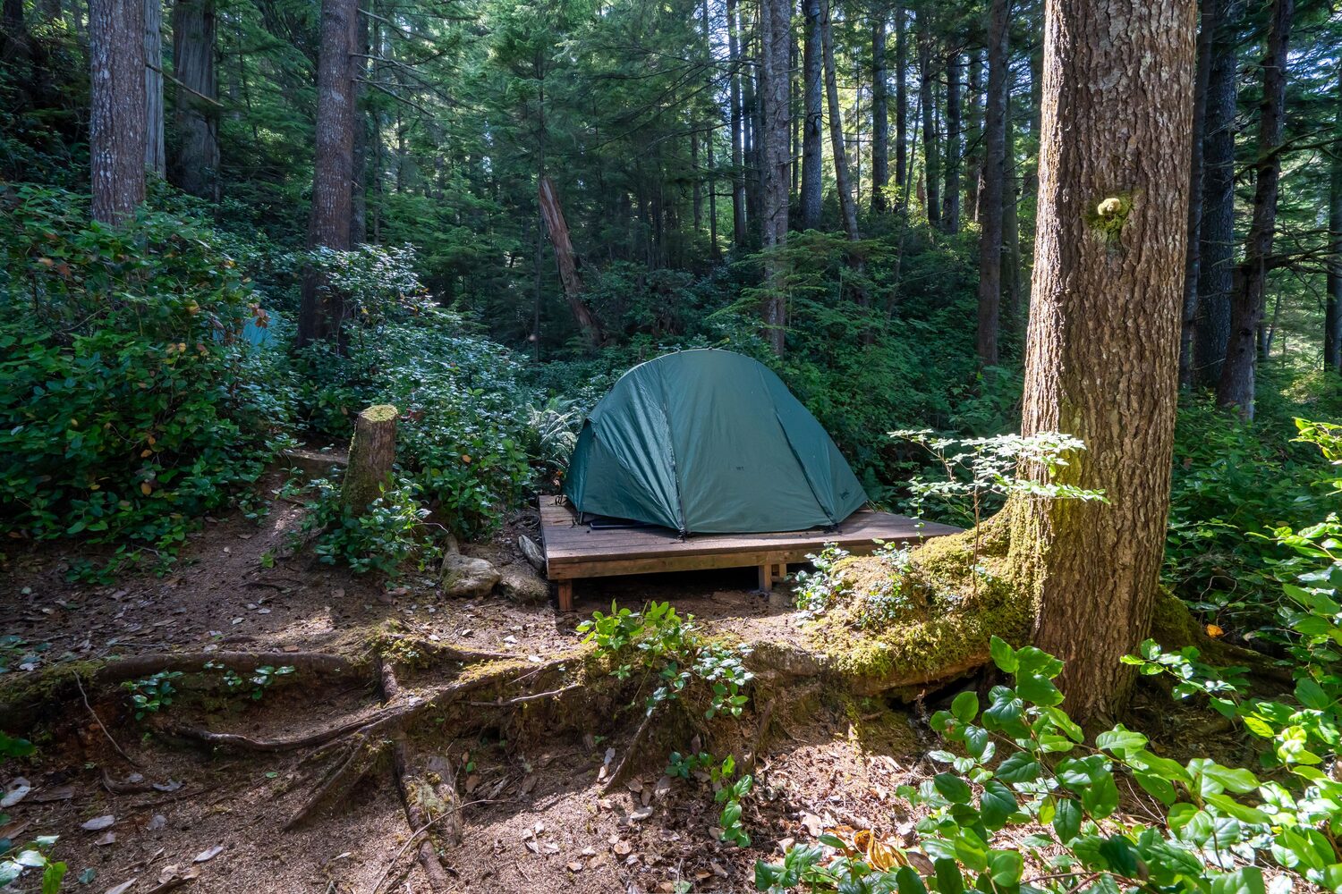 A majestic rainforest of towering cedars and mighty firs envelopes the rugged and rocky shoreline of the basecamp in Johnstone Strait. The sleeping tents are nestled into private little nooks, artfully scattered throughout the sprawling forest, presenting a breathtaking view of the beach and the bay beyond. There's nothing quite as tranquil as waking up in your tent to the melodious chirping of songbirds and basking in the mossy and earthy scent of the surrounding wilderness after a day of exhilarating kayaking with the magnificent whales. Fall asleep to the hypnotic and soothing sound of leaping salmon in the dead of the night in complete and absolute darkness, cocooned by the verdant canopy of this majestic forest.