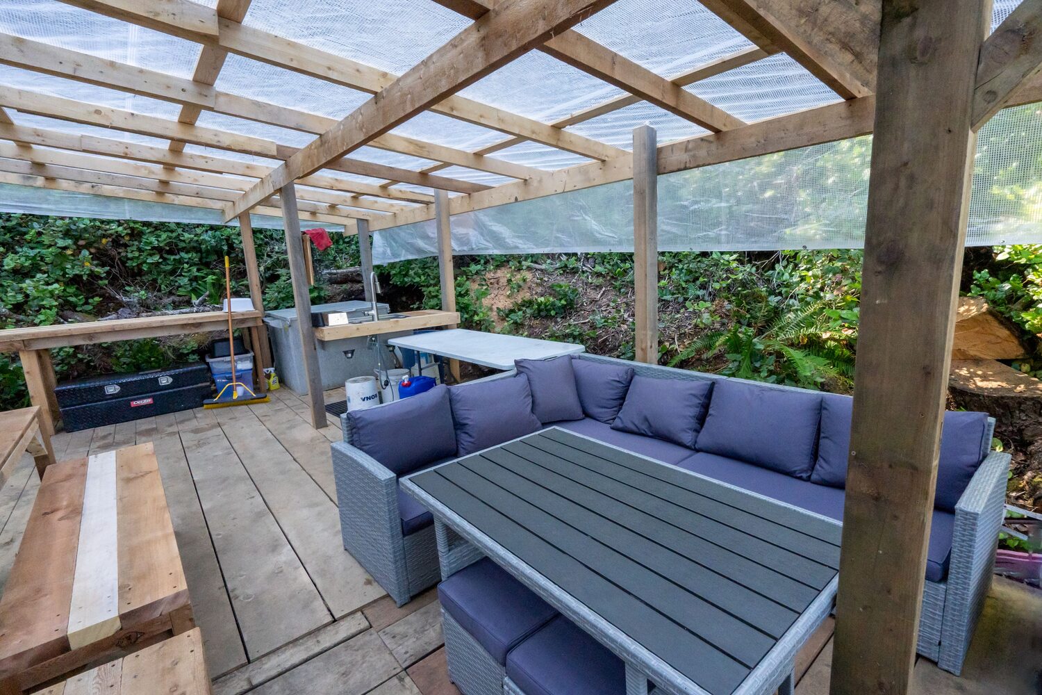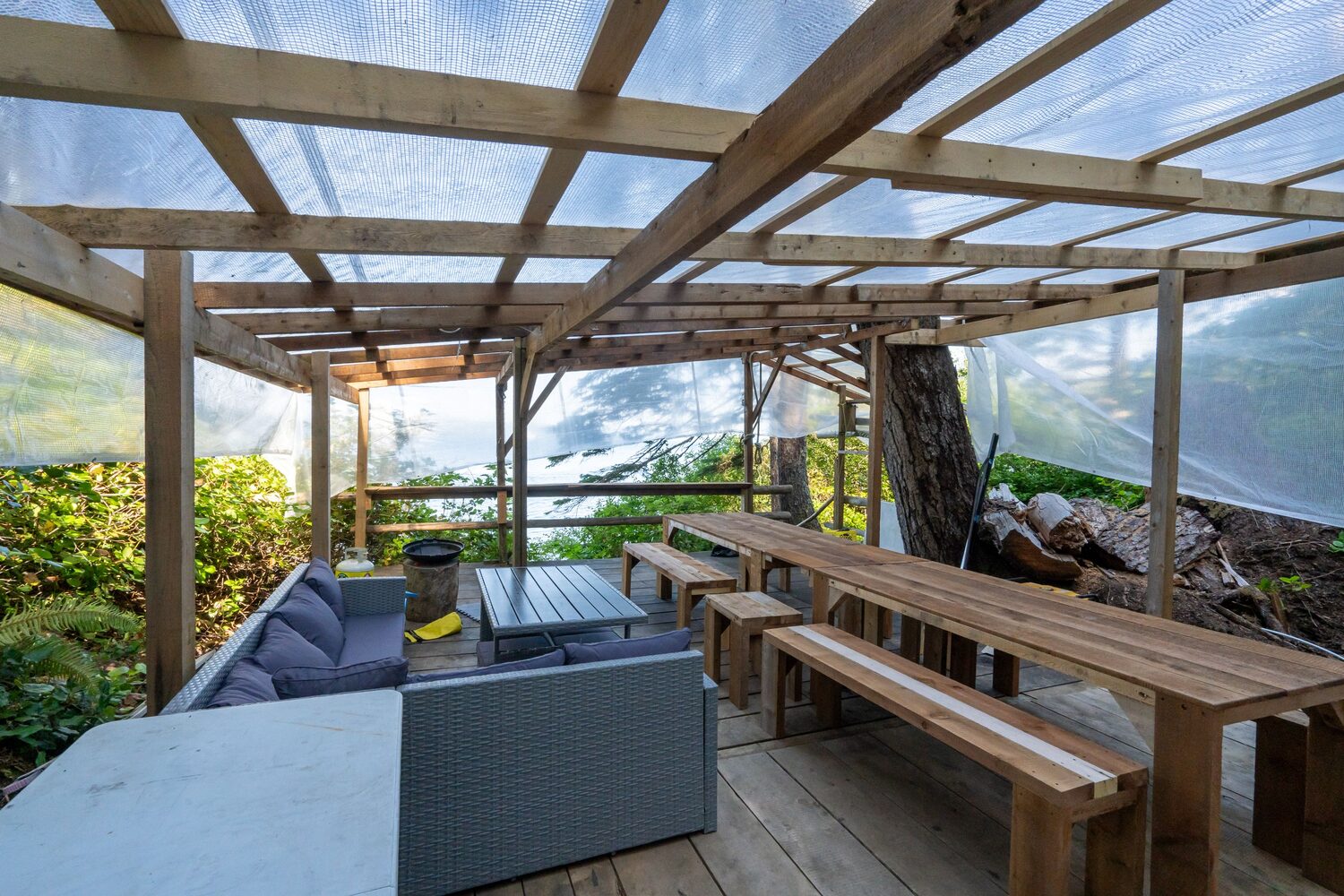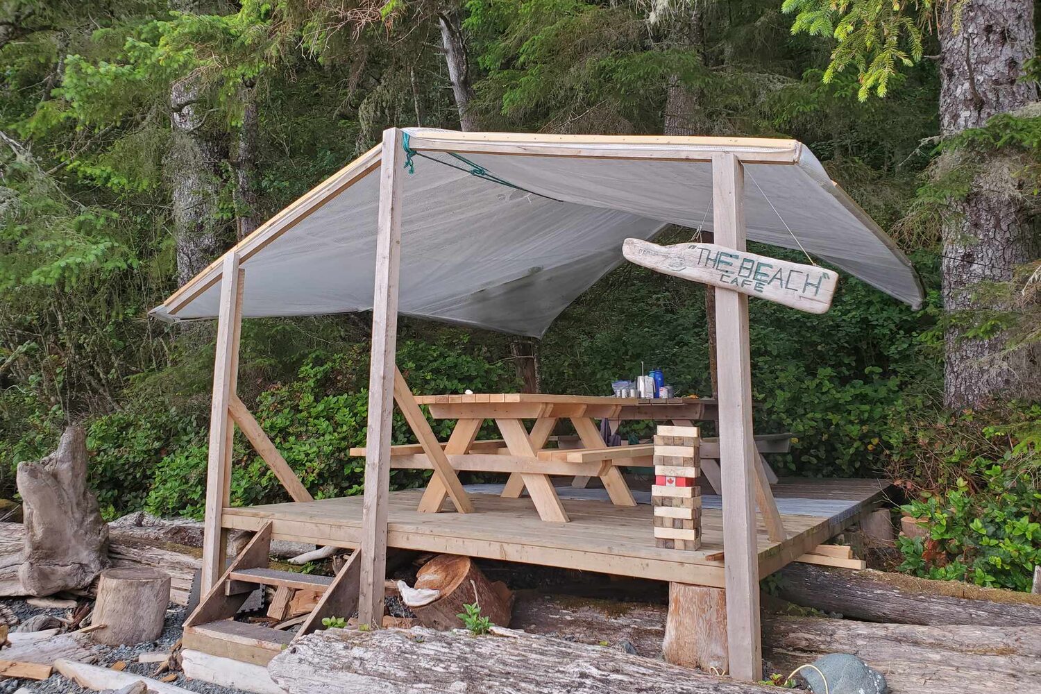 The camp also has showers with on demand hot water, composting toilets, a hot tub, a covered dining and lounge platform with tables, chairs and a sofa, plus camp chairs for relaxing around the campfire.