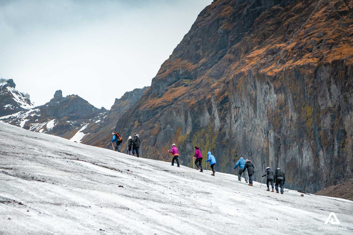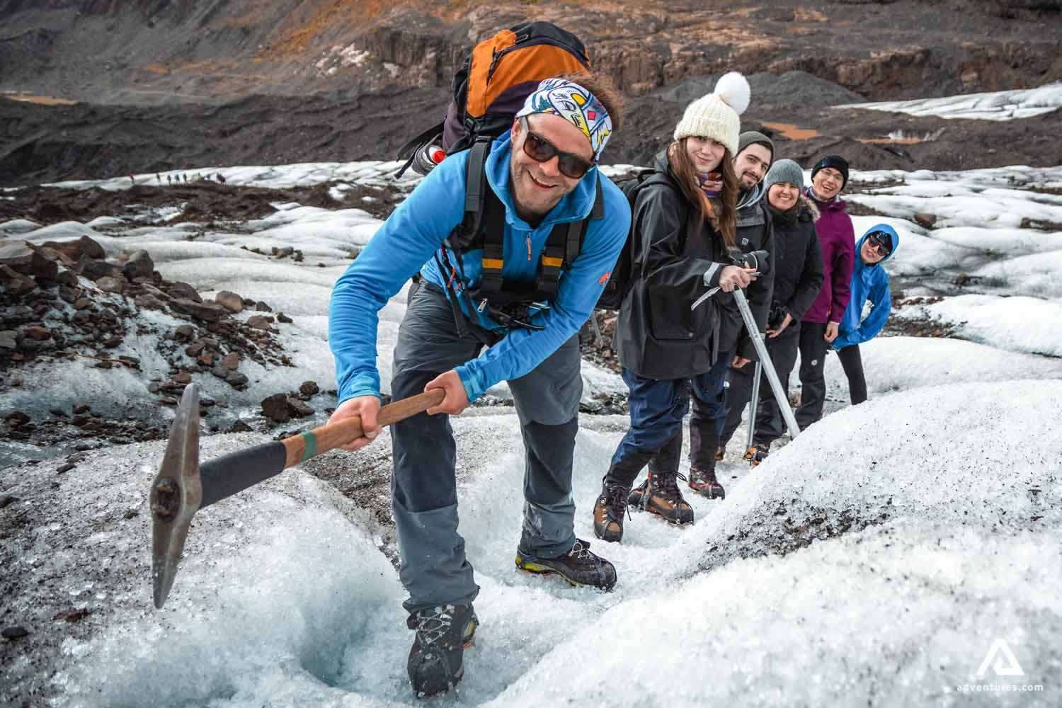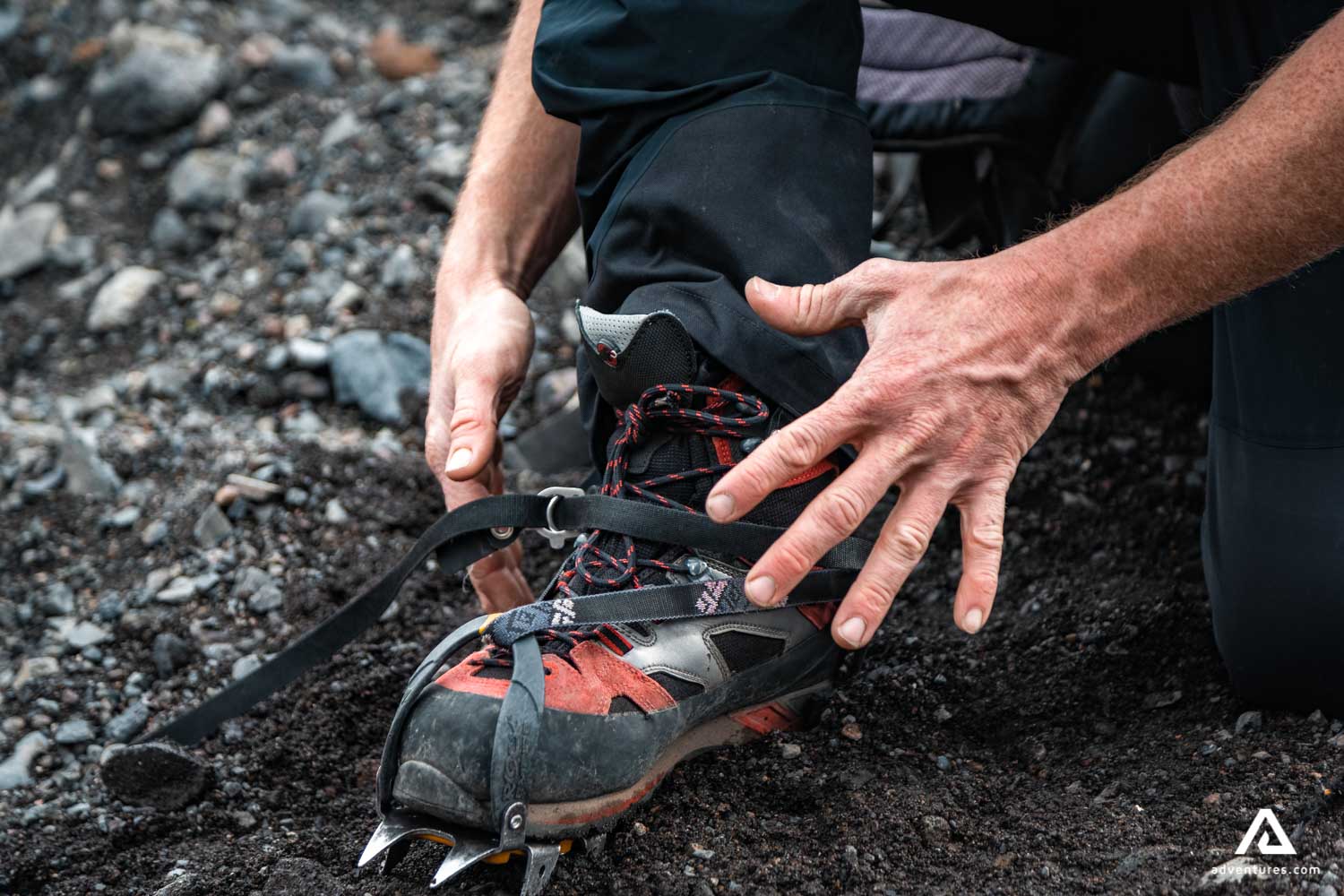 Bevor wir unsere Wanderung starten, müssen wir uns ausrüsten. Es ist wichtig die richtigen Schuhe zu tragen. Für diejenigen, die Wanderschuhe gemietet haben stehen die Schuhe bereit. Außerdem rüsten wir Sie mit Steigeisen aus und zeigen Ihnen wie Sie diese an Ihren Schuhen anbringen. Die Steigeisen ermöglichen das problemlose Laufen auf Eis und Sie müssen keine Angst mehr haben auszurutschen. Des weiteren erhalten Sie einen Eispickel und einen Helm.