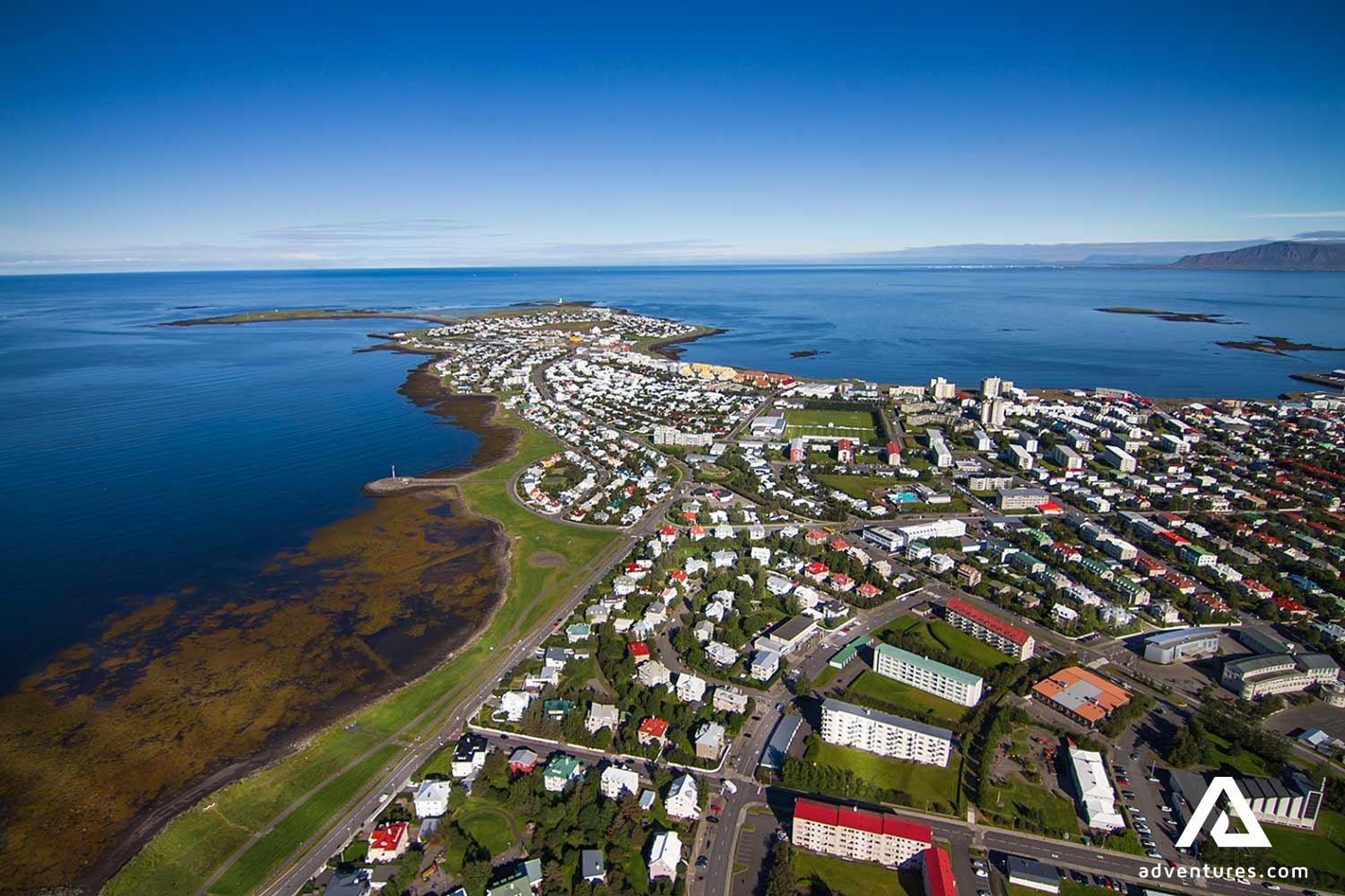 Genießen Sie die unvergessliche Panoramaaussicht auf die Küstenlinie, Skyline von Reykjavík und die entfernten Berge.