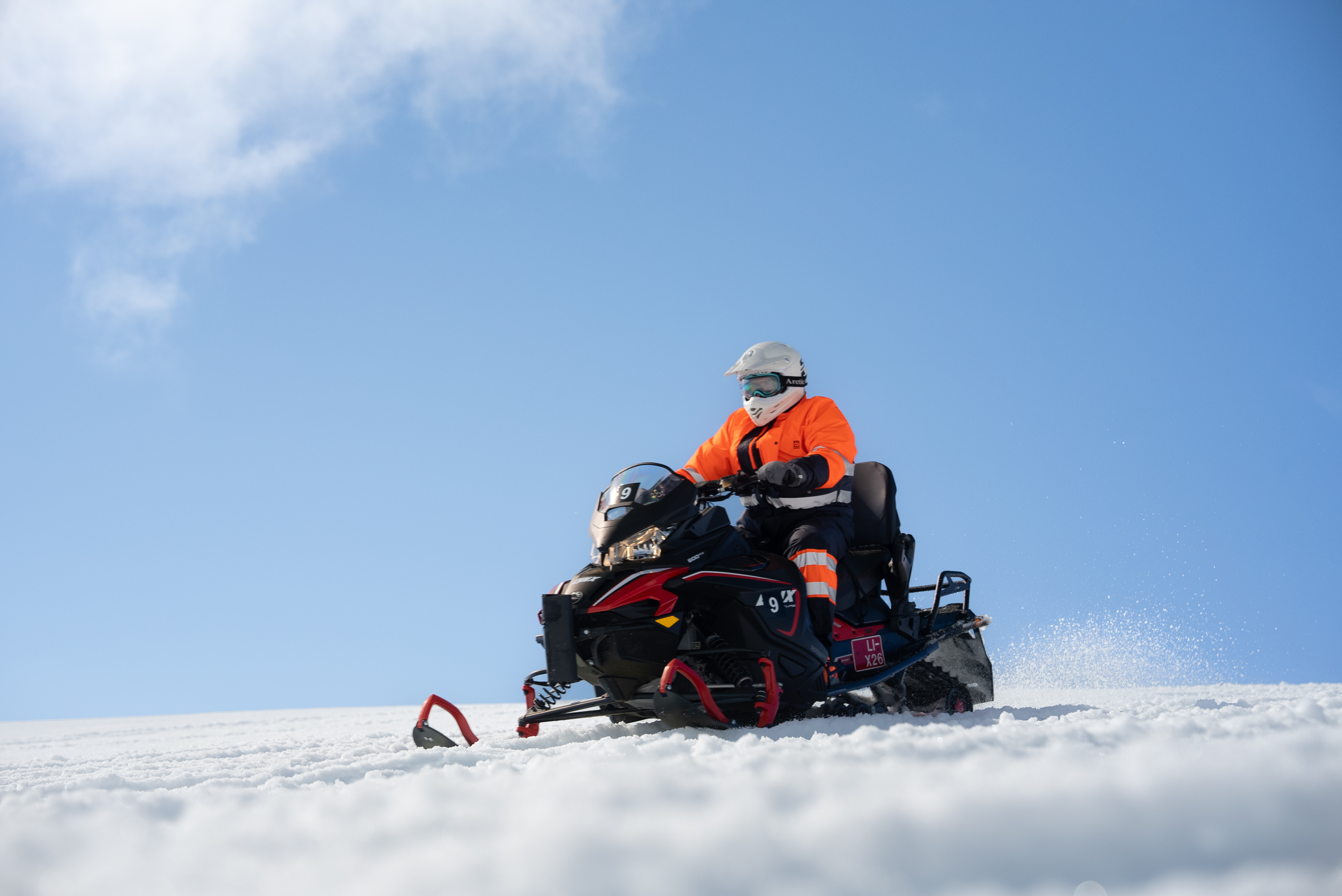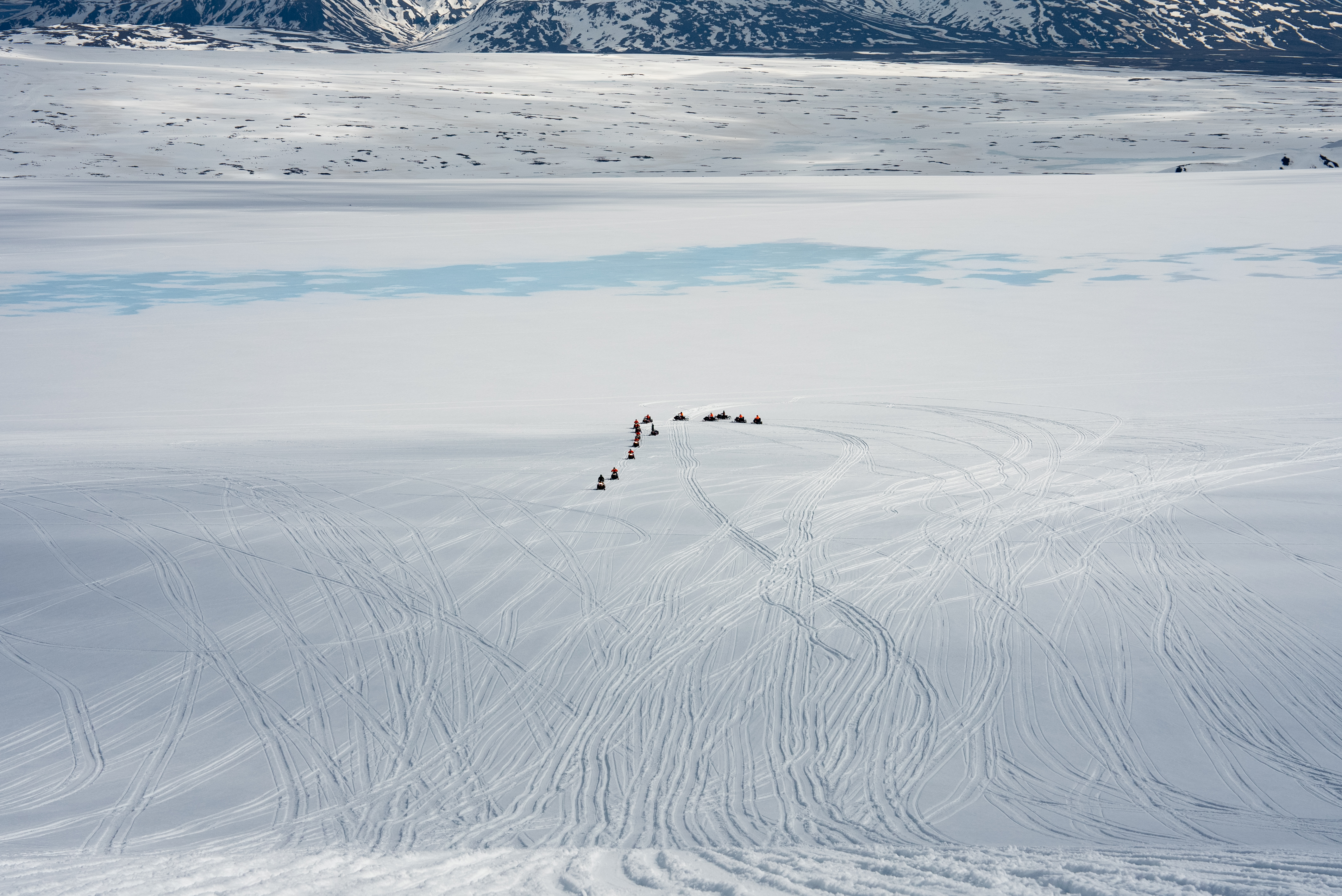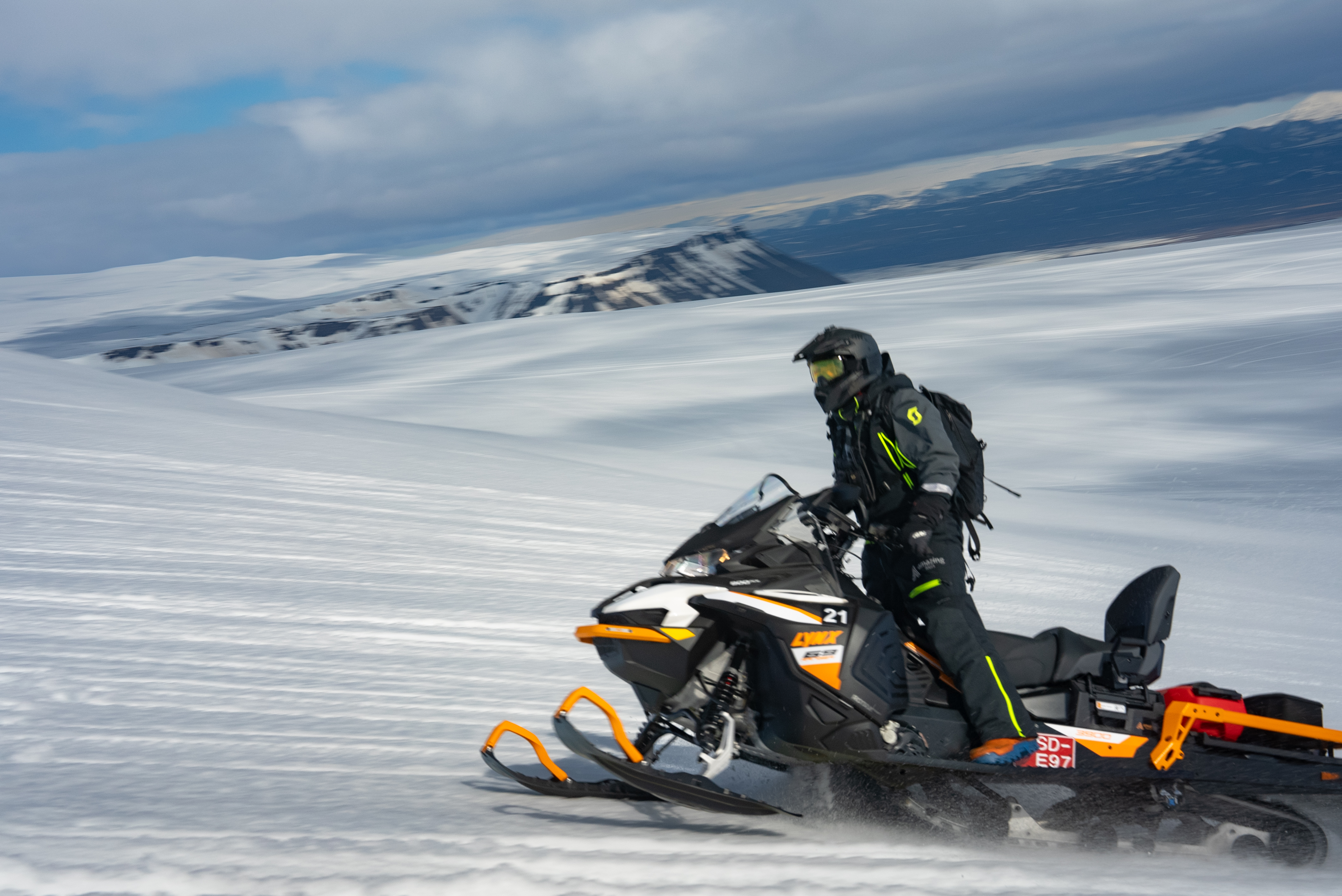 Wir beginnen das Schneemobilabenteuer, indem wir Sie am Skjól. Von hier aus begeben wir uns auf die malerische Fahrt zum Langjökull Gletscher; ein wundervoller Weg, um die wilde und unberührte Natur Islands zu bewundern. Wenn wir an unserer mobilen Gletscherbasisstation angekommen sind, rüsten wir Sie mit allem aus, was Sie benötigen werden: Anzüge, Handschuhe und ein Helm, trotzdem sollten Sie sich warm anziehen! Dann treffen Sie Ihren zertifizierten Gletscherguide, der Ihnen eine Sicherheitseinweisung in die Schneemobile gibt, bevor Sie offiziell Ihre Reise auf dem Gletscher beginnen können.
