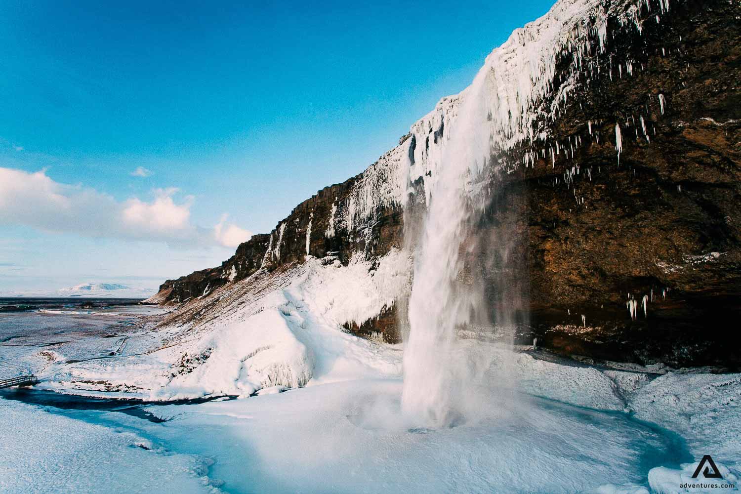 Unser erster Halt ist der Wasserfall Seljalandsfoss, wo Sie hinter die Kaskade gehen können, um eine einzigartige Perspektive zu genießen. Er ist einer der berühmtesten Wasserfälle Islands, liegt am Fuße des Eyjafjallajökull und sein Wasser stammt vom Gletscher.