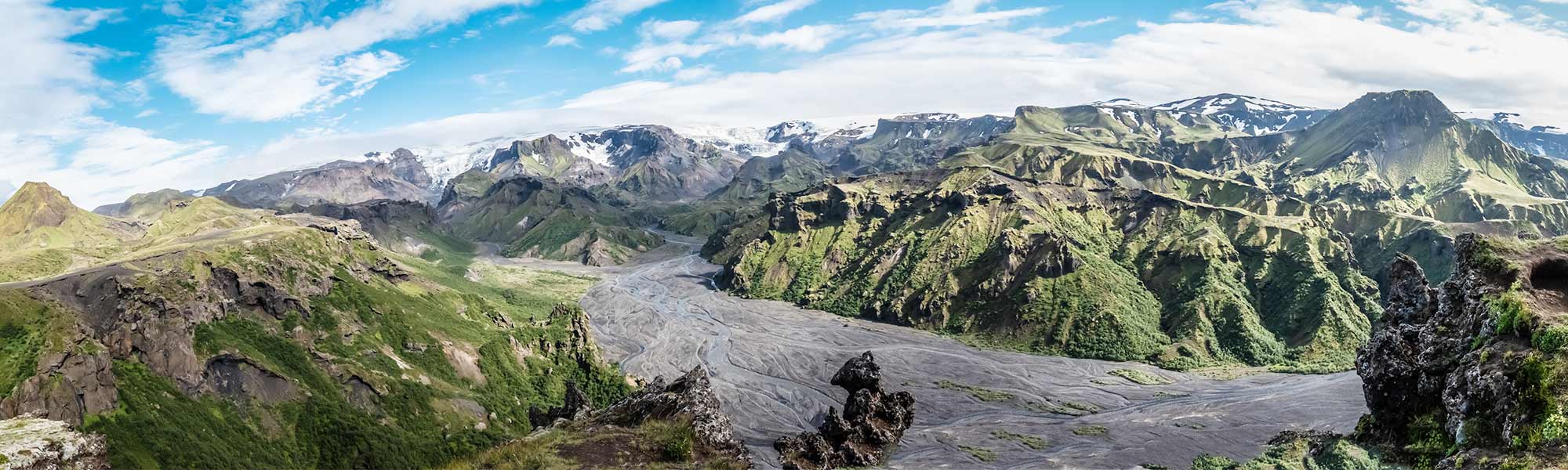 Thorsmork ist Islands beliebtestes Wandergebiet und es wird Ihnen den Atem rauben, hier von den Bergen ins Tal zu blicken.