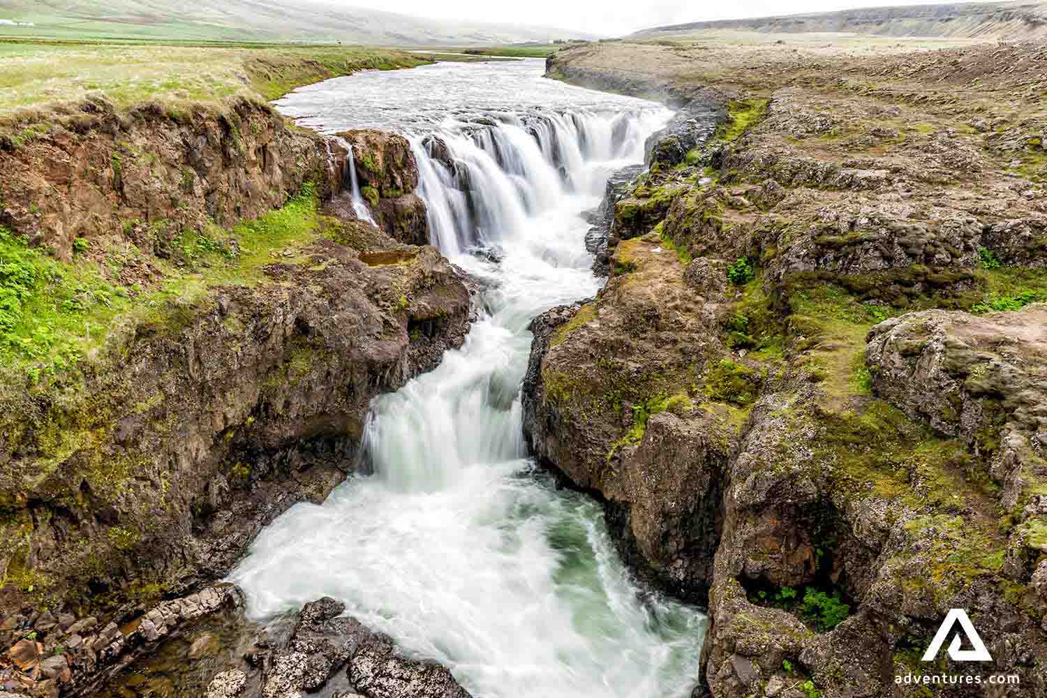 Am achten Tag werden Sie Nordisland hinter sich lassen und zur Snæfellsnes-Halbinsel aufbrechen. Die Route führt Sie entlang hügeliger Berge und steiniger Küsten zu Ihrem ersten Stop, eine geheimnisvollen Schlucht namens Kolugljufur. Der Wasserfall Kolufossur verläuft über einen zerklüfteten Hügel, wo seine Wasserstrahlen sich kleine Bäche aufspalten und sich unaufhaltsam in die Schlucht stürzen.
