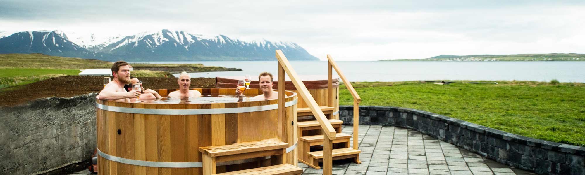 Vous pouvez ajouter l'accès à la zone extérieure pour 500 ISK supplémentaires. Cela comprend les bains à remous avec de l'eau normale et un sauna extérieur. Détendez-vous dans un jacuzzi avec une vue imprenable sur l'île d'Hrísey, les montagnes et la vallée de Thorvalds.