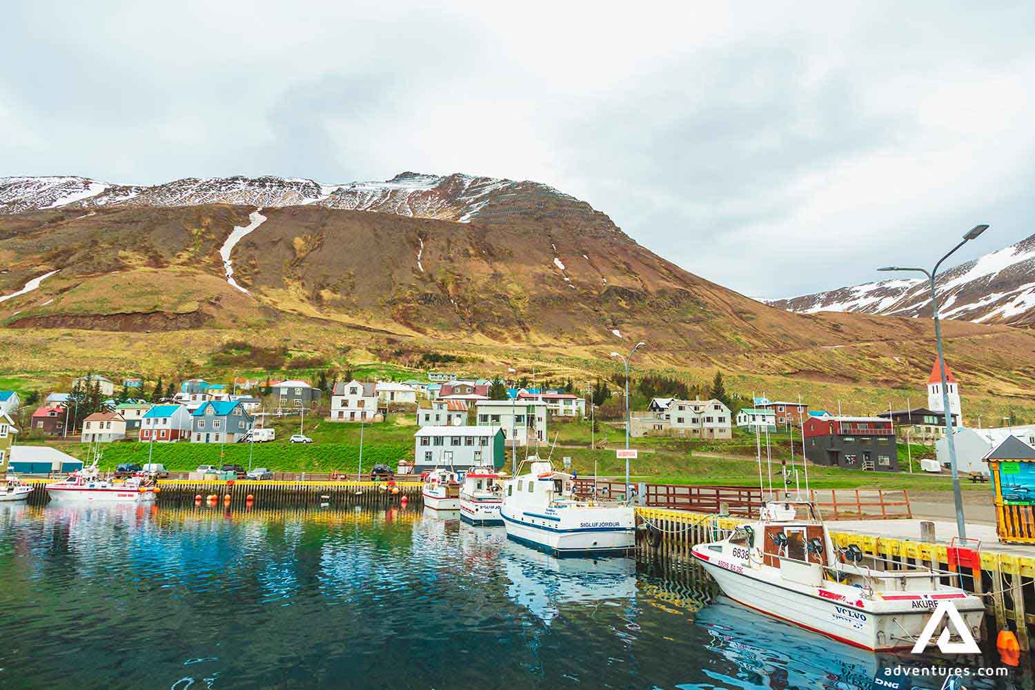 Siglufjordur town harbor by the mountains