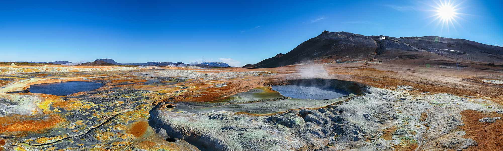Namaskard is a low, narrow pass near Mt. Námafjall and Lake Mývatn known for its rugged terrain and powerful geothermal activity. The area is scattered with thermal springs and fuming vents, which creates a mythical setting. The mixture of colors, vapors, and sulfuric smell displays Iceland's natural forces.