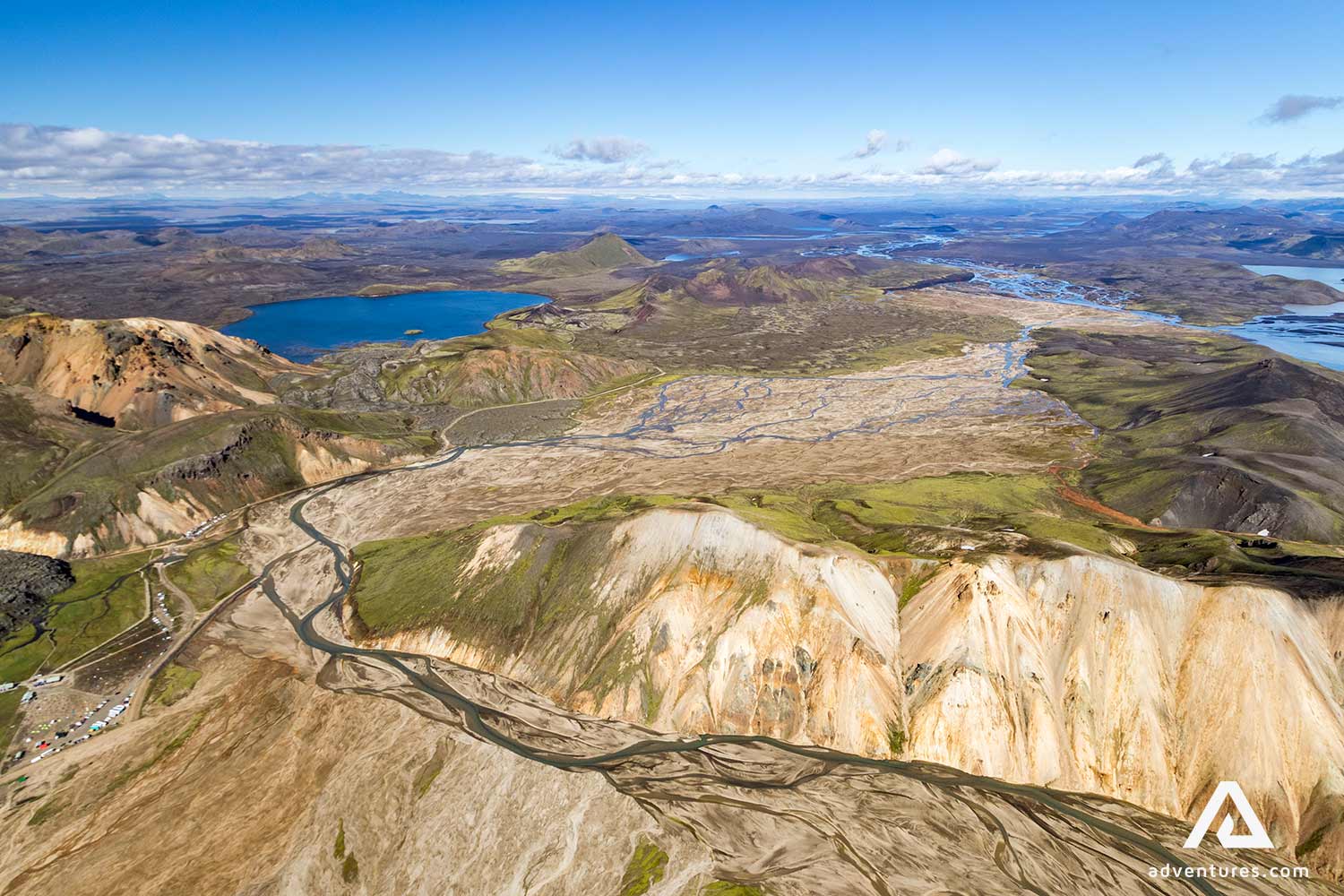 From there, we will push on to the geothermal paradise of Landmannalaugar famed for its stunning rainbow-colored rhyolite mountains and bubbling hot spring valleys. We'll fly over young lava fields, steaming valleys, and spectacular curving rivers.