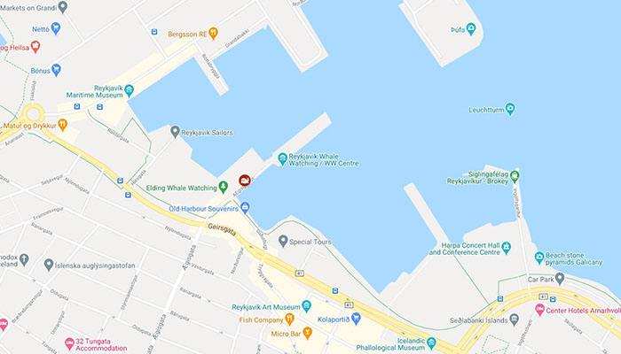 The meeting location is at the Old Harbor in the downtown area at the Special Tours Ticket Office, located at Ægisgarður 13, 101 Reykjavík.