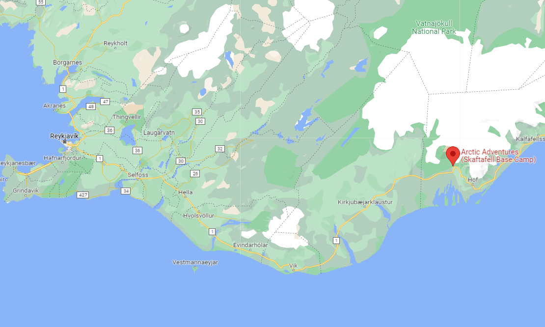 Your adventure starts at our Skaftafell Booking Center, located about 327 km (203 mi) east of Reykjavík. The closest towns are Kirkjubæjarklaustur (69 km / 43 mi west) and Höfn (130 km / 81 mi east).