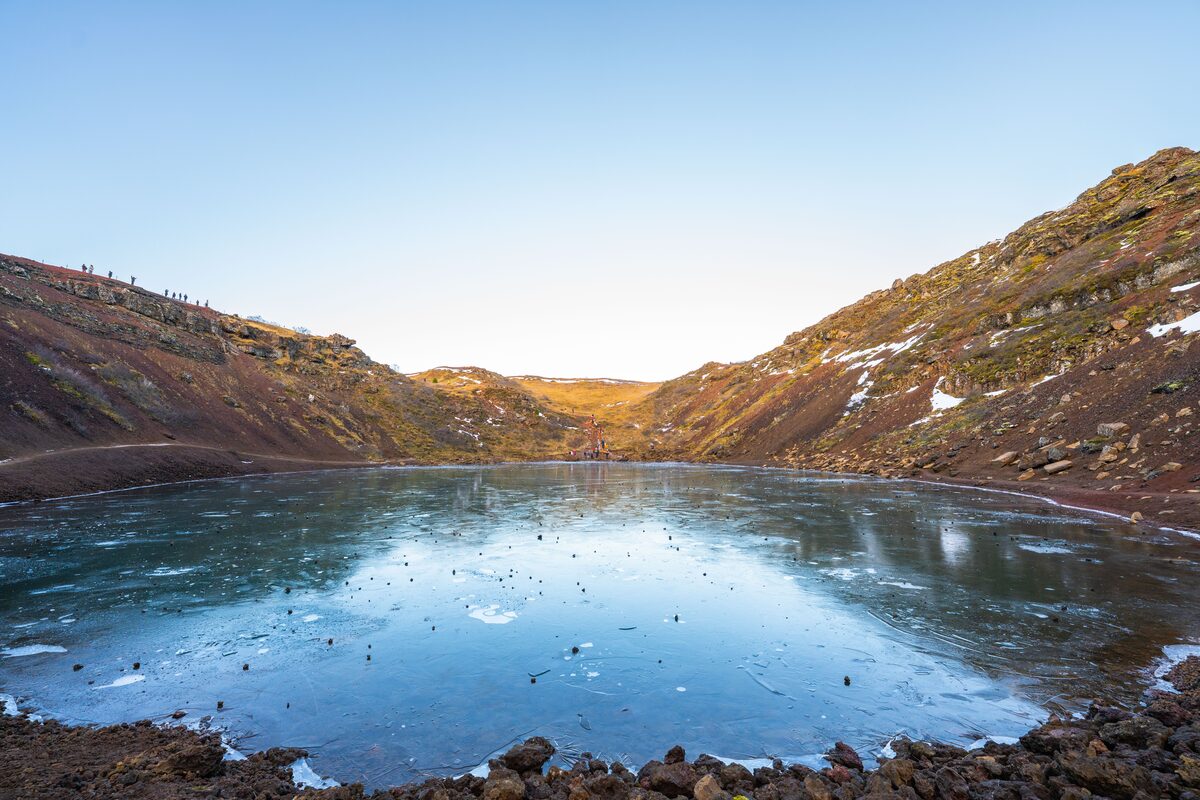 Before heading back, we’ll stop at the 6,500-year-old Kerið Crater, where the land opens into a circle of colors. Standing on the rim, you’ll see a vivid blue lake at the bottom of the caldera. In summer, the slopes are red from the minerals and covered in moss. Winter makes the lake stand out beautifully against the snow—a photographer’s dream.