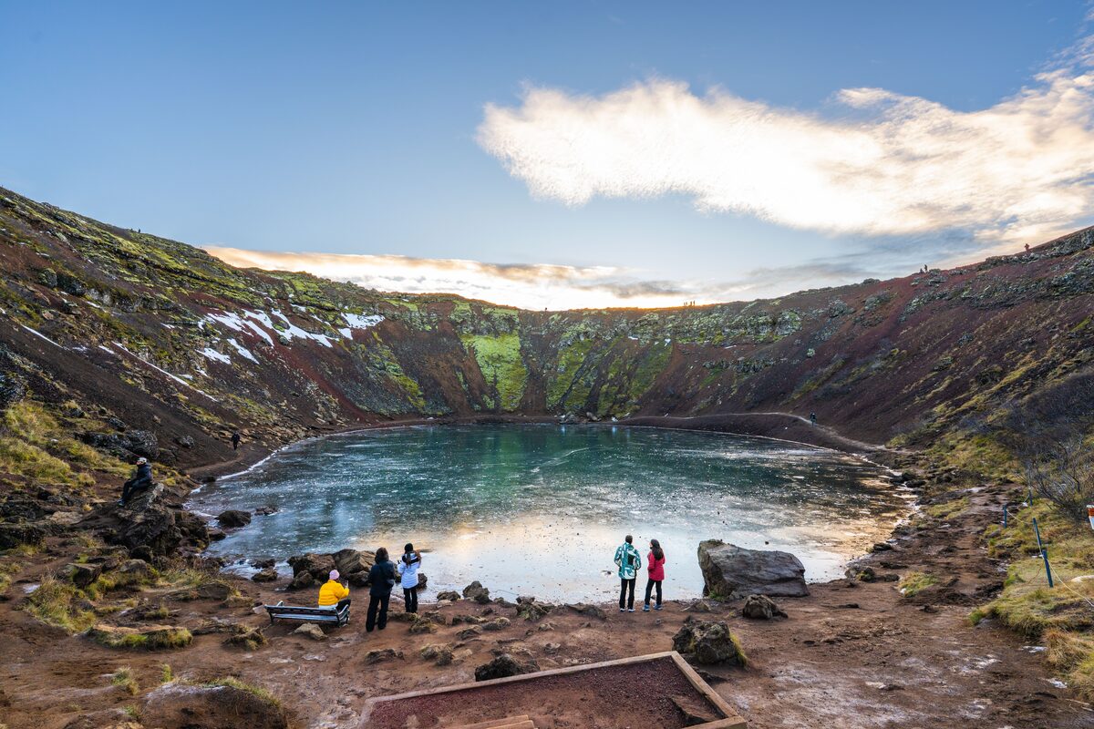Before returning to Reykjavík, we’ll visit the 6,500-year-old Kerið Crater, a perfectly shaped volcanic caldera. From the rim, look down at the calm blue lake resting below. In summer, the red slopes and green moss make it feel like the eye of the Earth itself; in winter, the icy blue contrasts with the white snow—a favorite stop among photographers.
