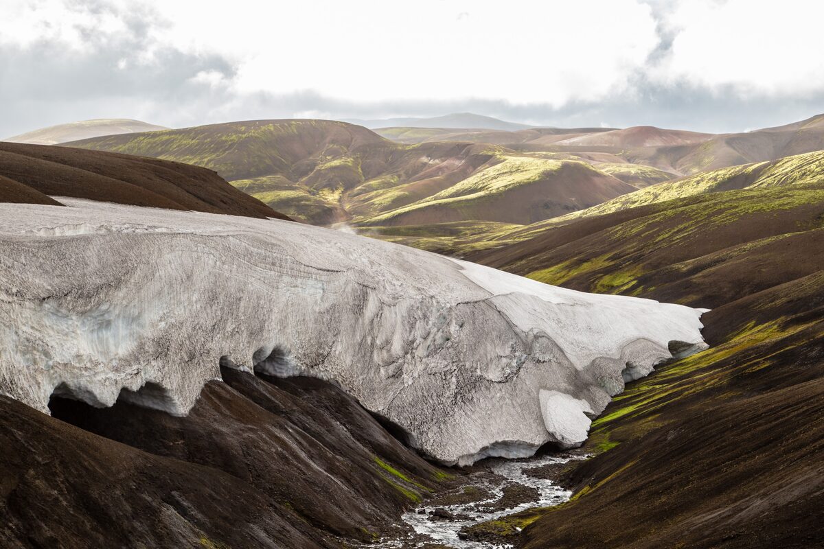 Here, you’ll ease into the Laugavegur Trail with a gentle first-day warm-up loop. Hike across the otherworldly Laugahraun lava field, wander through the vibrant Grænagil gorge, and take in the views of the Bláhnjúkur volcano.