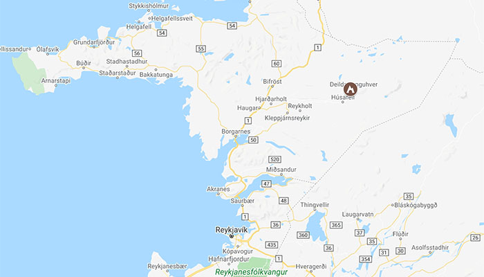 The cave is located in West Iceland, in Borgarfjordur, not far from Hotel Húsafell. It takes around 2 hours to drive there from Reykjavik. The cave is accessible by all vehicles and clearly marked on nearby roads. Look for Fljótstunga, The Cave or Víðgelmir. Click here for the location on a map.
