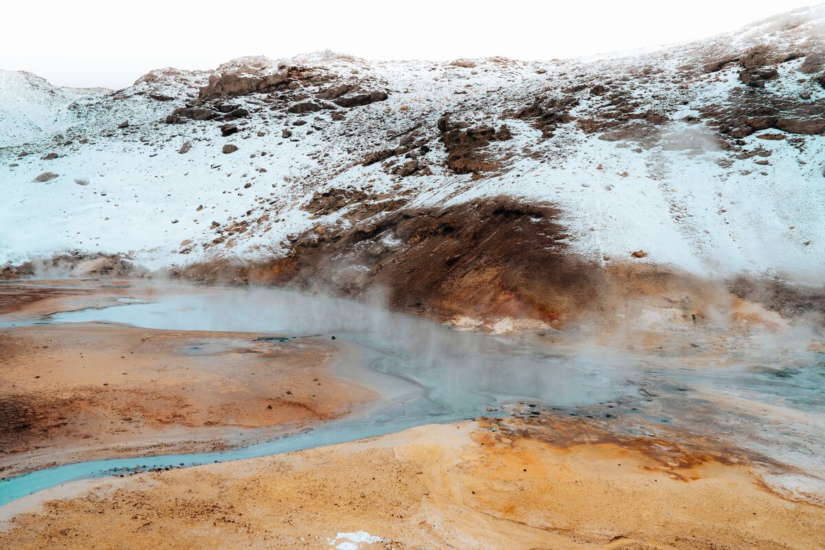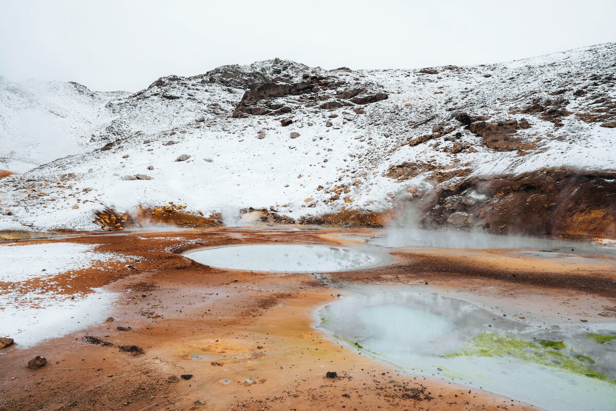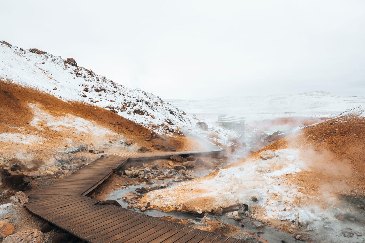 Next, you’ll head to the otherworldly Seltún geothermal area, located in the Krýsuvík area. This stop feels like stepping onto another planet, with steaming vents, bubbling mud pools, and vividly colored hills in shades of red, yellow, and grey.