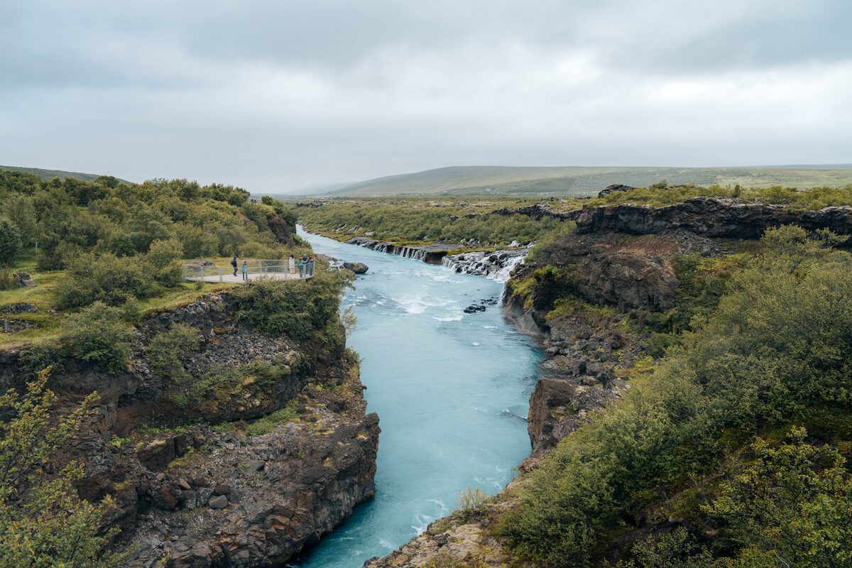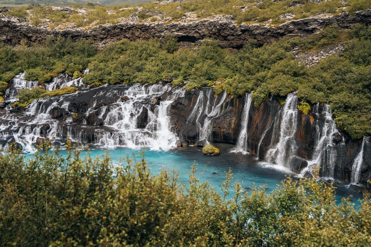 Next, we arrive at Hraunfossar, a series of small yet spectacular waterfalls. This unique site, formed over 1,000 years ago by glacial waters weaving through the lava field, fuses volcanic history with breathtaking scenery. Nearby is Barnafoss, or “Children’s Falls,” which flows through a narrow, winding ravine. Your expert guide will share the fascinating legend behind its name—whether fact or myth, we’ll leave it for you to decide!