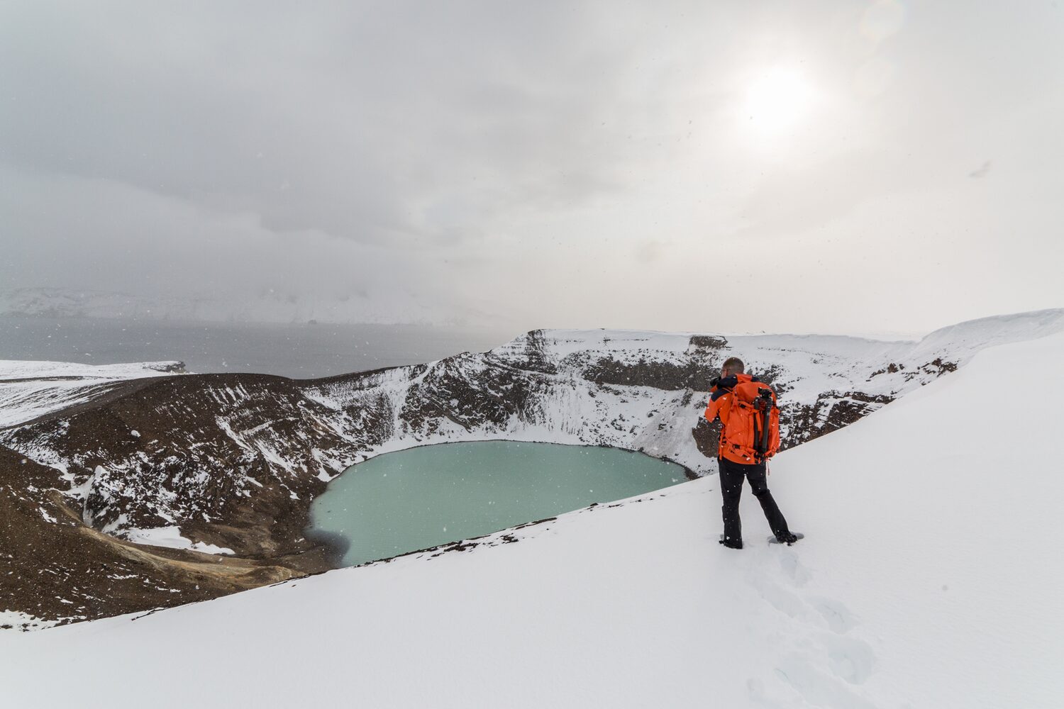 Our main stop is Askja, the complex of nested calderas with otherworldly landscapes. The guide will choose the best time and peak weather conditions to explore Askja Caldera and take the 2.5-kilometer hike to Lake Víti. Depending on the weather, this breathtaking Askja trail is easy to moderate in difficulty, taking around 35 to 45 minutes to complete.