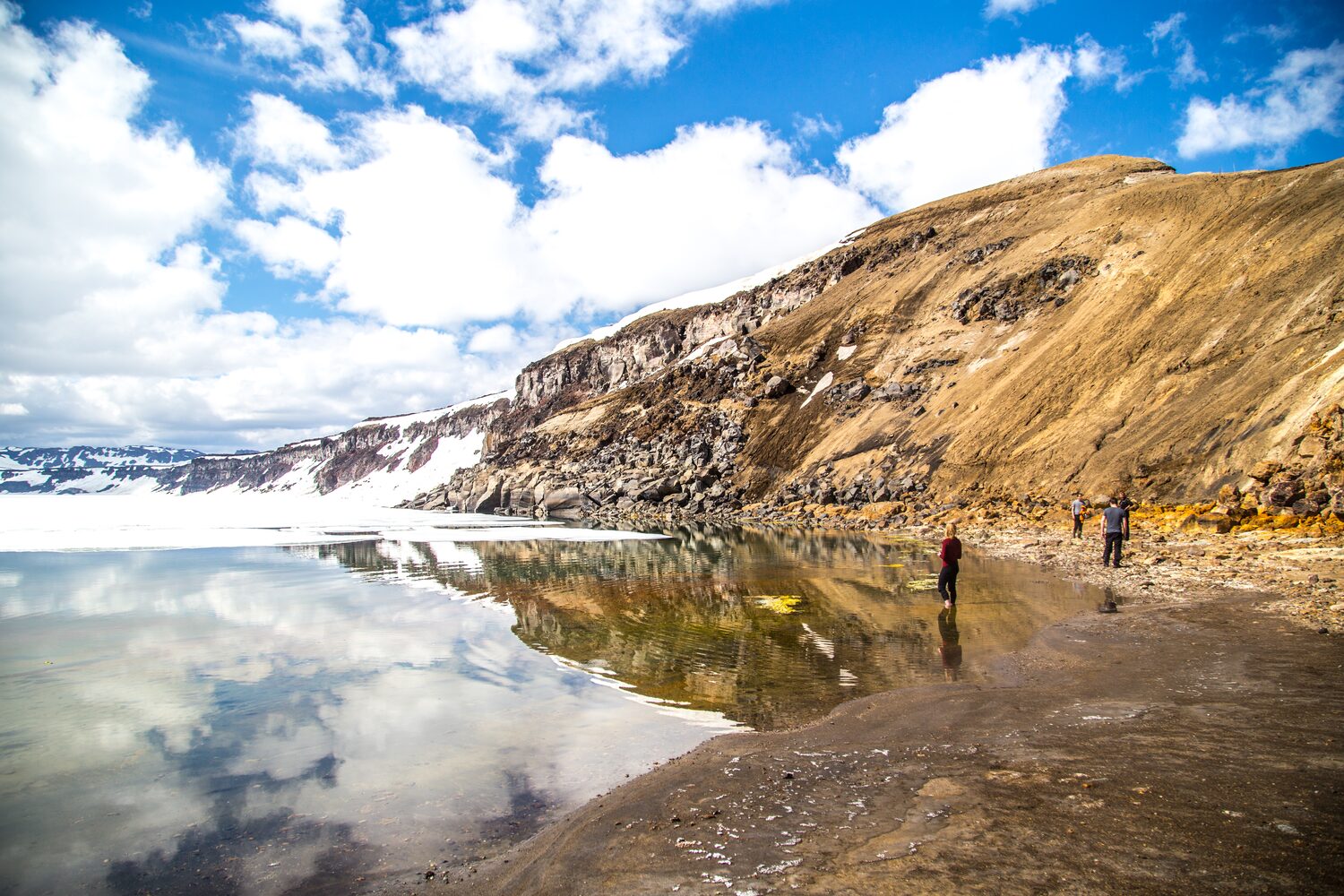 When you arrive at Víti, you will be amazed by its stunning beauty and calm atmosphere. You can take a refreshing swim in the blue geothermal waters of the lake (if it’s late summer) or walk around the crater rim, enjoying the surrounding views. Experience Askja at your own speed before returning to the Super Jeep to continue the captivating journey.