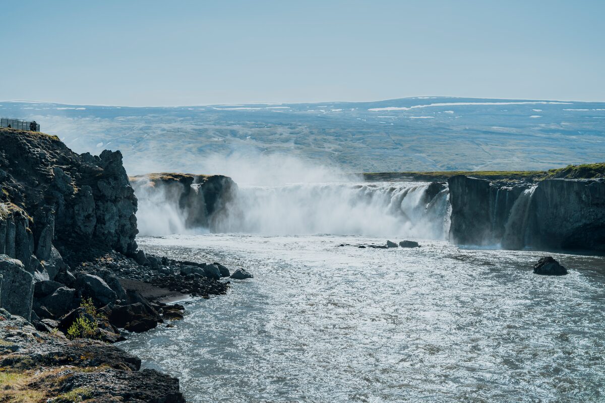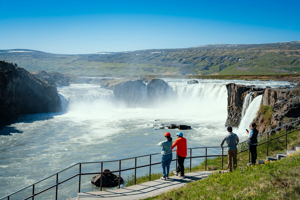We also drive to the Námaskarð Geothermal Area, where you'll see bubbling mud pots and colorful mineral deposits. After that, we'll explore Dimmuborgir Lava Formations, a mysterious place with twisted rock formations. Finally, we'll stop to see the stunning Goðafoss Waterfall, also known as the "Waterfall of the Gods."
