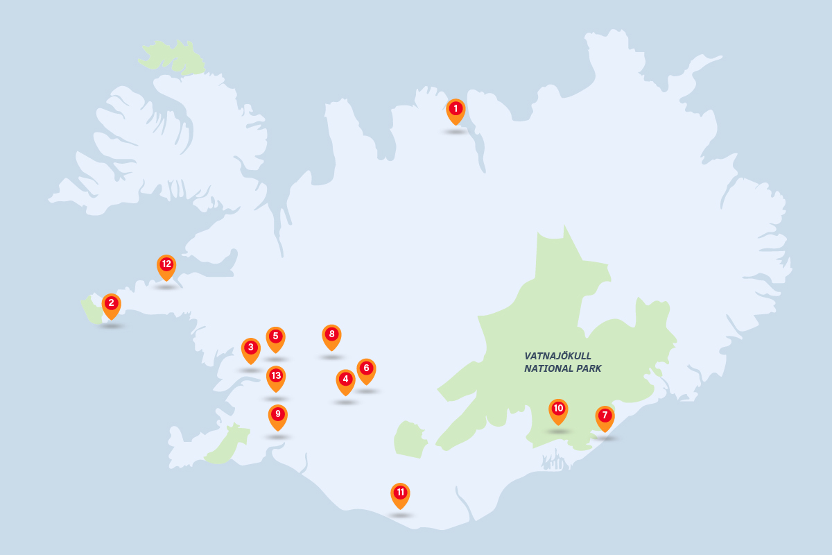 The map below displays all of our meeting points in Iceland. Below the map you will find a list of noteworthy locations with more detailed information.